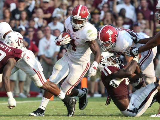 Amari Cooper ellen a mérkőzés nagy részében remek munkát végzett Deshazor Everett, csak a felé szálló passzok harmadát tudta lehúzni a Bama sztár wide receivere (2 catch, 34 yard), mögötte viszont lényegében a Tide teljes elkapóállománya terítékre került; Kevin Norwood, valamint az inkább big play threatként, mintsem folyamatosan megjátszható célpontként számon tartott DeAndrew White és Kenny Bell is szerzett touchdownt. Az utóbbi években Tuscaloosában inkább csak blokkolásban erős tight endeket foglalkoztattak, Brian Vogler, és még inkább a freshman O.J. Howard viszont új dimenziót nyithat a Crimson Tide passzjátékában. Ketten együtt a Kyle Fielden is elértek 6 elkapásból 92 yardot, ebből 68-at az újonc vállalt. Rutinosabb játékos lévén még Vogler kerül pályára gyakrabban, de a félelmetesen atletikus Howard az, aki valódi matchup rémálom lehet a védelmek számára. Az alabamai offense hagyományosan a ground-and-pound stílusról ismert, de a szombati meccsen már ízelítőt kaptunk abból, mire lehet képes a támadóegység egy McCarron szintű irányítóval és ilyen fegyverarzenállal passzorientált üzemmódban. Az Aggies második pontszerzését követő három támadássorozatuk során a vendégek összesen 12 alkalommal hívtak passzt, és mindössze kétszer adták valamelyik running back kezébe a labdát, végig up-tempo módban haladtak, a három drive átlagosan 1 perc 48 másodpercig tartott és 78 yardot ölelt fel (átlagban közel 17 yard/play). A következő támadássorozatot hét perccel a szünet előtt indíthatta a csapat, az óra lepörgetésének céljából visszatértek a futásközpontú játékhoz, majd a második félidőben egy 3&out után az interception return TD már 21 pontos előnyhöz juttatta őket, így újfent a time management került előtérbe, ennek megfelelően az up-tempo offense-t és a pass heavy playcallingot már nem vették elő. Az említett három drive alatt azonban megmutatta a támadósor, hogy a levegőben éppúgy képes dominálni, mint a földön.