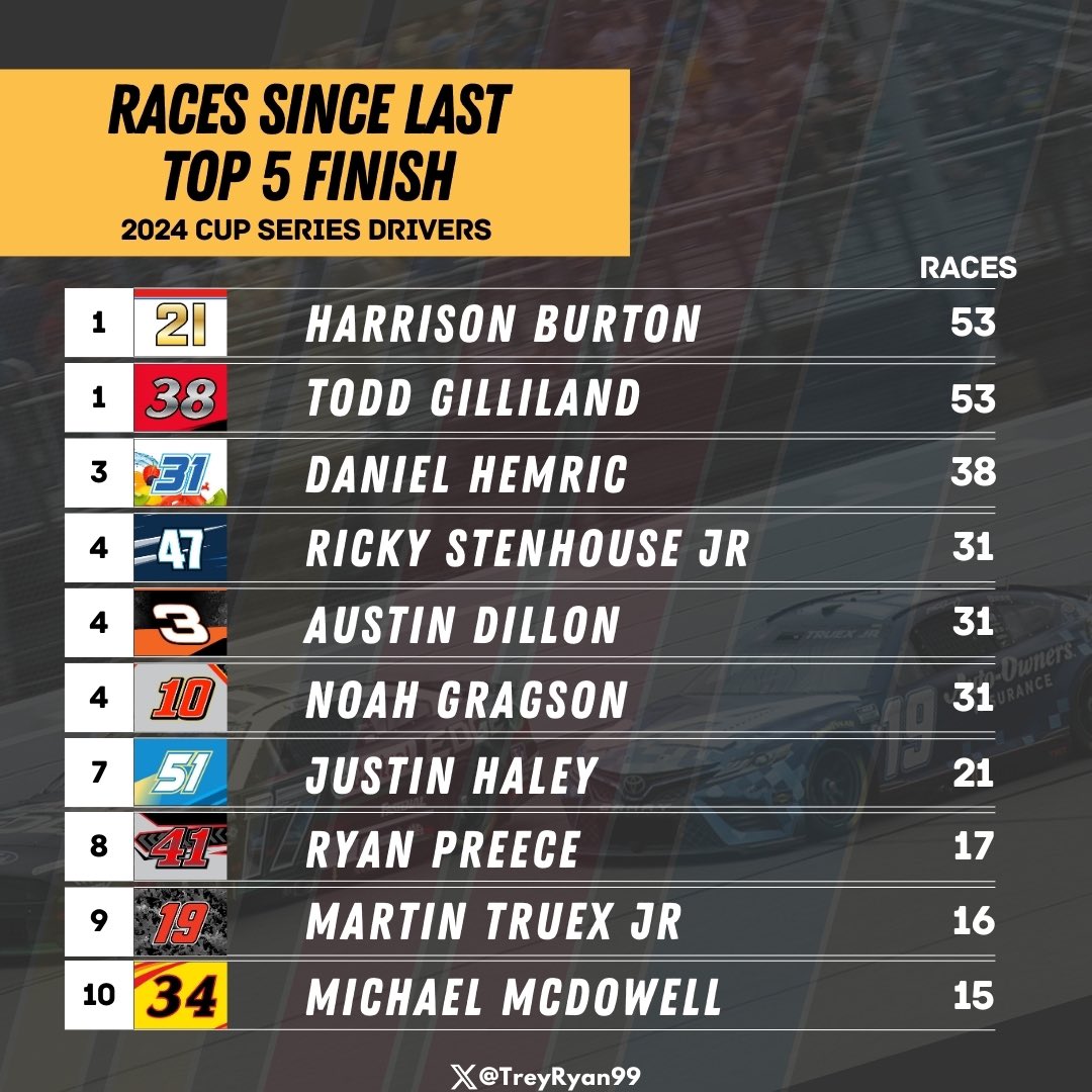 Gragson P7 a phoenixi kvalin.Nagyszerűen kezdi a szezont, két Top 10-es helyezés, és a harmadik versenyen is a Top 10 környékéről esett ki mások hülyesége miatt. És most már rajtolni is a Top 10-ből fog.