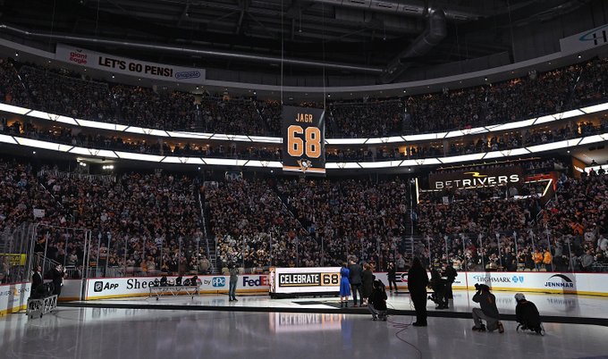 The Pens take the ice in Jaromir Jagr's No. 68 sweater and mullet wigs and ... WAIT A MINUTE THAT'S THE REAL JAGR 🍿 pic.twitter.com/F2eZwaNvxp