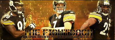 Amire én gondoltam: Ziggy Hood - Roethlisberger - Ryan Clark képe (ebben a sorrendben), lent középen nagyobb betűkkel 'The Fightback' felirat, alatta kisebb betűkkel 'Baltimore Ravens vs. Pittsburgh Steelers - 2011. 01. 05.'. A látvány és a színvilág lehetne hasonló, mint Matthew99 Polamalu-s sig-jénél.