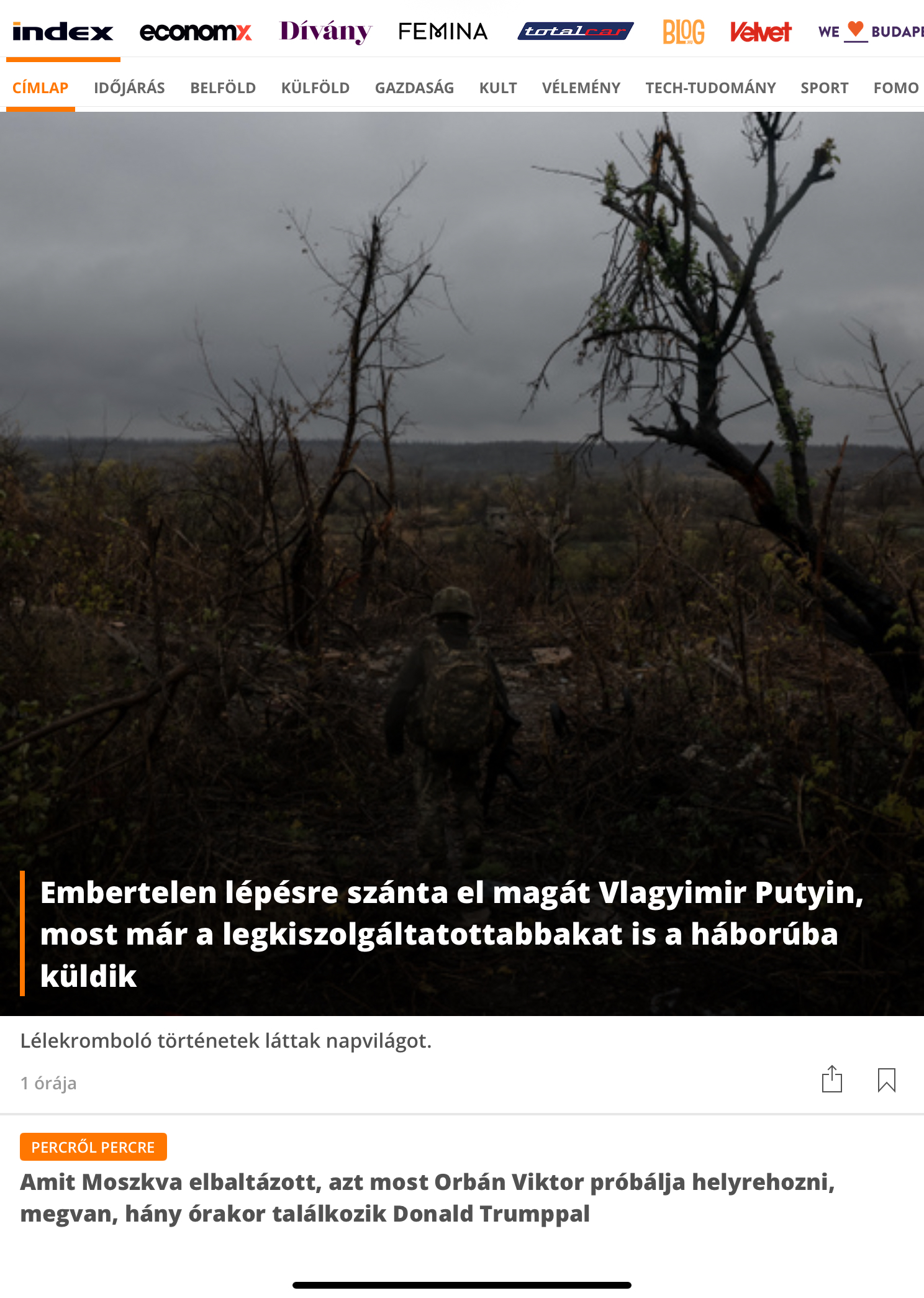 akkor rossz irányt választottak, a lavrov-féle vodkamezőkön kéne héderezniük - legalább szoknák a májusi levegőt...Igaz, de ha pénz paripa fegyver kell akkor azt most kell megbeszélni, mert most van meg valamennyi idő. Valamelyik podcastban mondták, és igaz is, ha szar az állás, akkor azt most kell elmondani, és a legmagasabb szinten kell segítséget kérni.Sokadszorra: a szavazófülke magányában ritkán jut az átlagos szavazó eszébe, hogy "dejo hogy OV volt Trumpnál", de az annál gyakrabban, hogy drága a hús. Ebben a harcban igen szarul állnak...Bármi lesz a két neonáci tárgyalásán az világraszóló sikerként lesz nyomatvaKorai volt ez az utazás Orbánnak, de sajnos ha lehet hinni a közvélemény kutatásoknak, akkor szarban van a haza és kell egy löket így karácsonyra neki. Igaz az emberek nagy többsége pont leszarja a karácsonyi készülődés, meg a pedofil botrányok, adatlopás, fenyegetés stb. mellett, hogy ez a hordó elment a Amerika fő faszahoz.