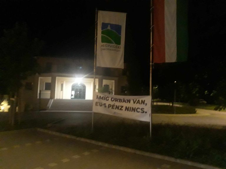 Amíg Orbán van, EU-s pénz nincs! feliratú molinót feszített ki a Momentum Orbán Viktor szavazókörének bejáratához az éjszaka.
