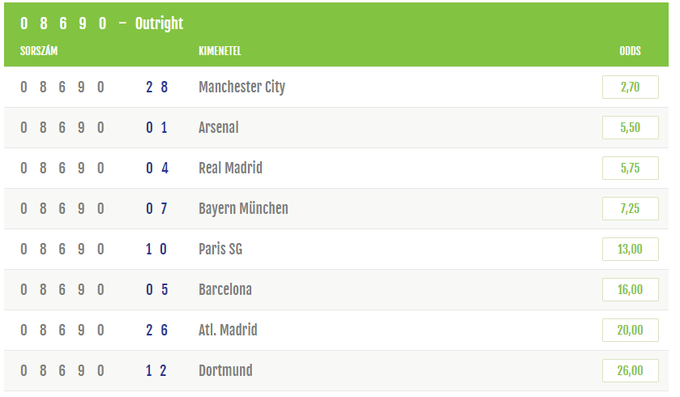 en is igy latom. picit elol van az Arsenal, nalam vhogy igy nez ki a ranking:Jelenlegi BL oddsok, ami az én erősorrendem isSemmi sem indokolja az Arsenal nyomását igazából a belterjes angol pudingok nagyotm ondó hülyeségein kívűl. Épphogy kiverték a portugál harmadikat, ezek után ne vicceljünk már hogy a City-n kívűl mindenhol ők lennének az esélyesek...