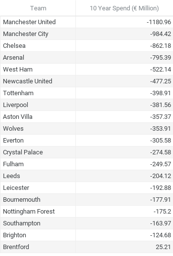 Vajon Brentford, Brighton mikor unja meg ezt a. Nem költünk idióta módón dolgot?Azért itt vegyük figyelembe, hogy több csapat nem volt végig PLes a 10 év alatt, sőt, van akiknek csak néhány év van. Az, hogy nem költesz a csempóban annyit, mint a PL csapatok az meg alap.