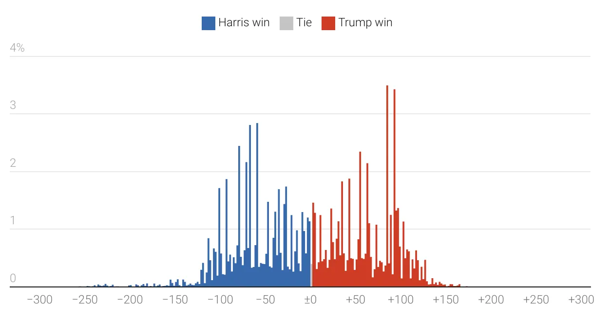 A végeredmény ott valahol a +50 és +100 között lesz, tehát statisztikailag a legvalószínűbb kimenetek közül az egyik. Ahogy statisztikailag a második legvalószínűbb kimenetek egy ellenkező oldali söprésnek néztek ki a pollok alapján.