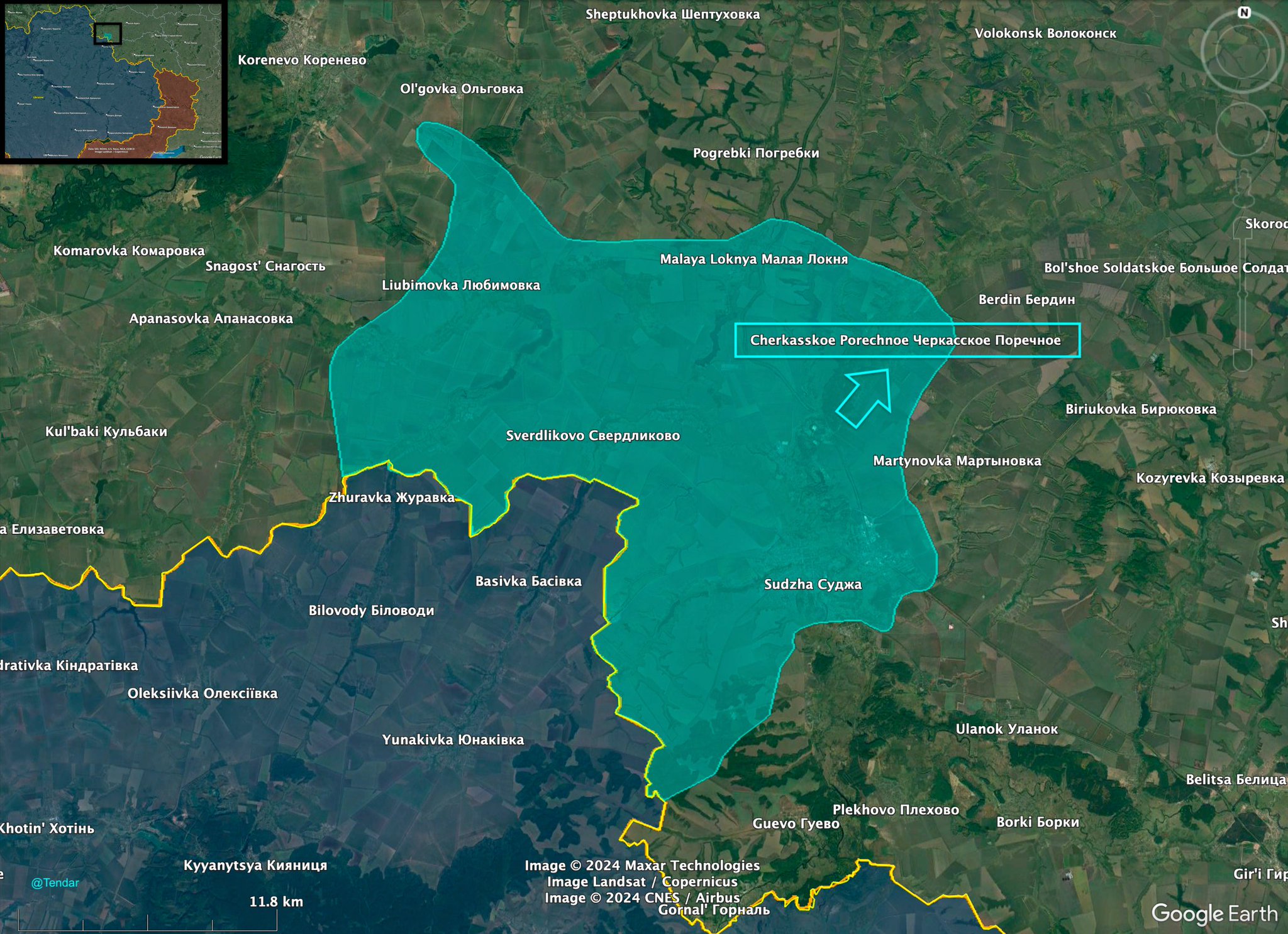 Ukrainian forces have consolidated gains north of Sudzha and have taken several towns up to the town of Cherkasskoe Porochnoe. The area is likely since days under AFU control, but Russian drone footage only now confirms it. This make around 470 square kilometers (185 square miles) under Ukrainian control in less than 5 days.The map shows only very conservative Ukrainian gains. There is reason to believe that they are far deeper into the Kursk region, according Pro-Russian claims as deep as 35 km.