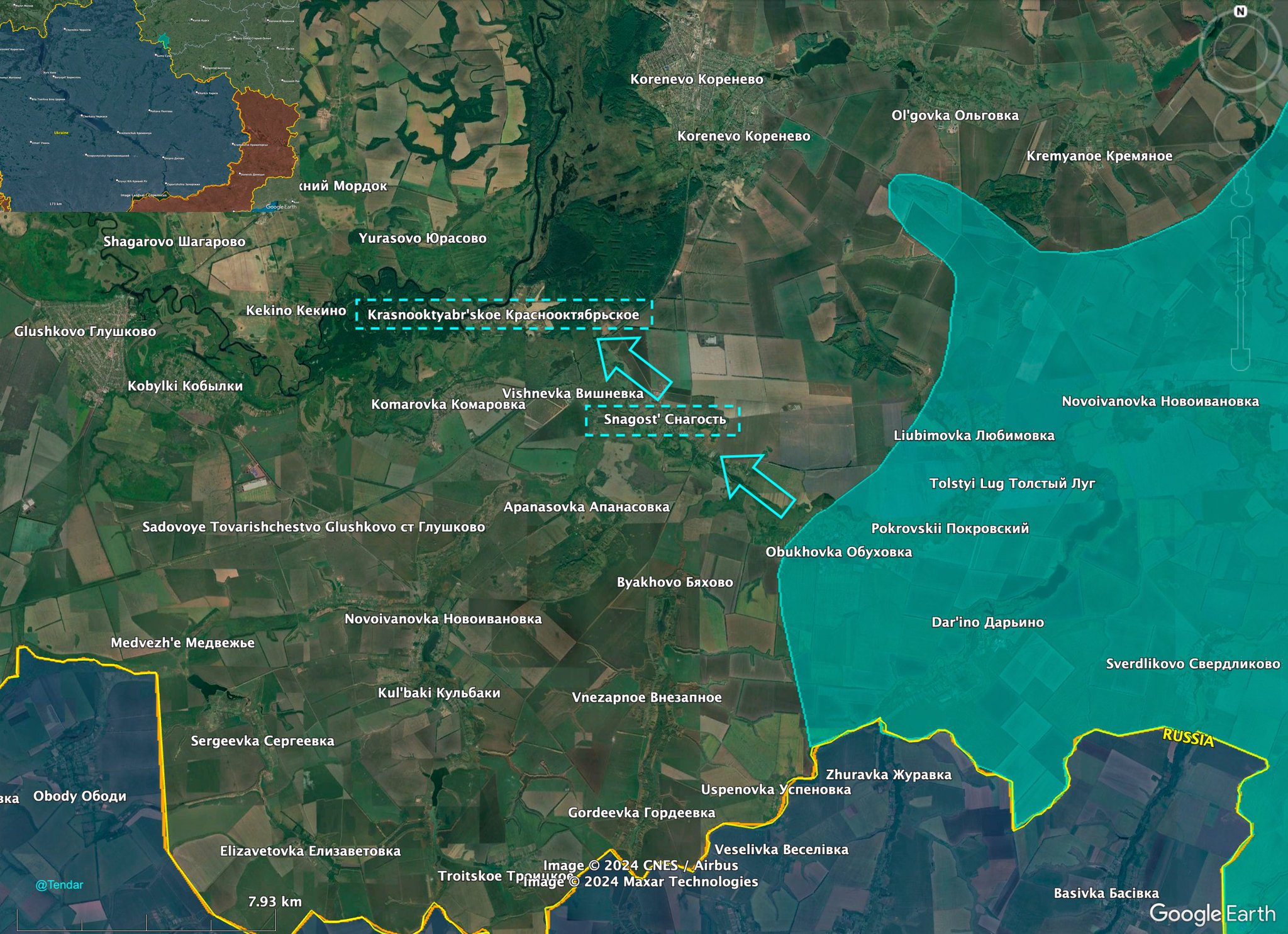 Russian refugees from the Korenevsky District, Kursk Region, report that Ukrainian forces are in the villages of Snagost and Krasnooktyabr'skoe, basically cutting of the entire southern part of the district. Furthermore, the say that the entire district is in chaos.