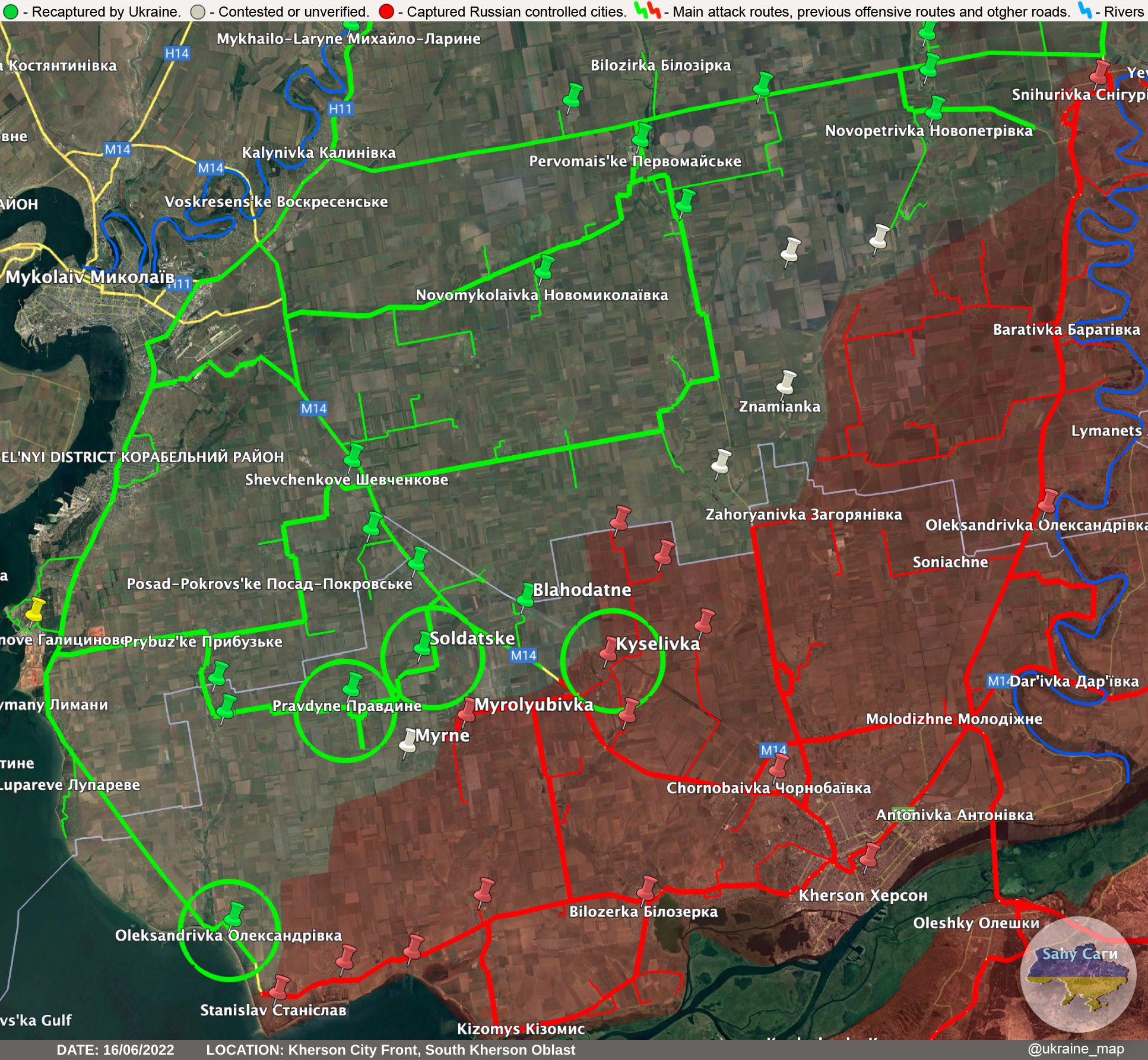 Kherson Map (June 17 1:30 AM)Ukrainian Forces have liberated the villages of Soldatske and Pravdyne.
