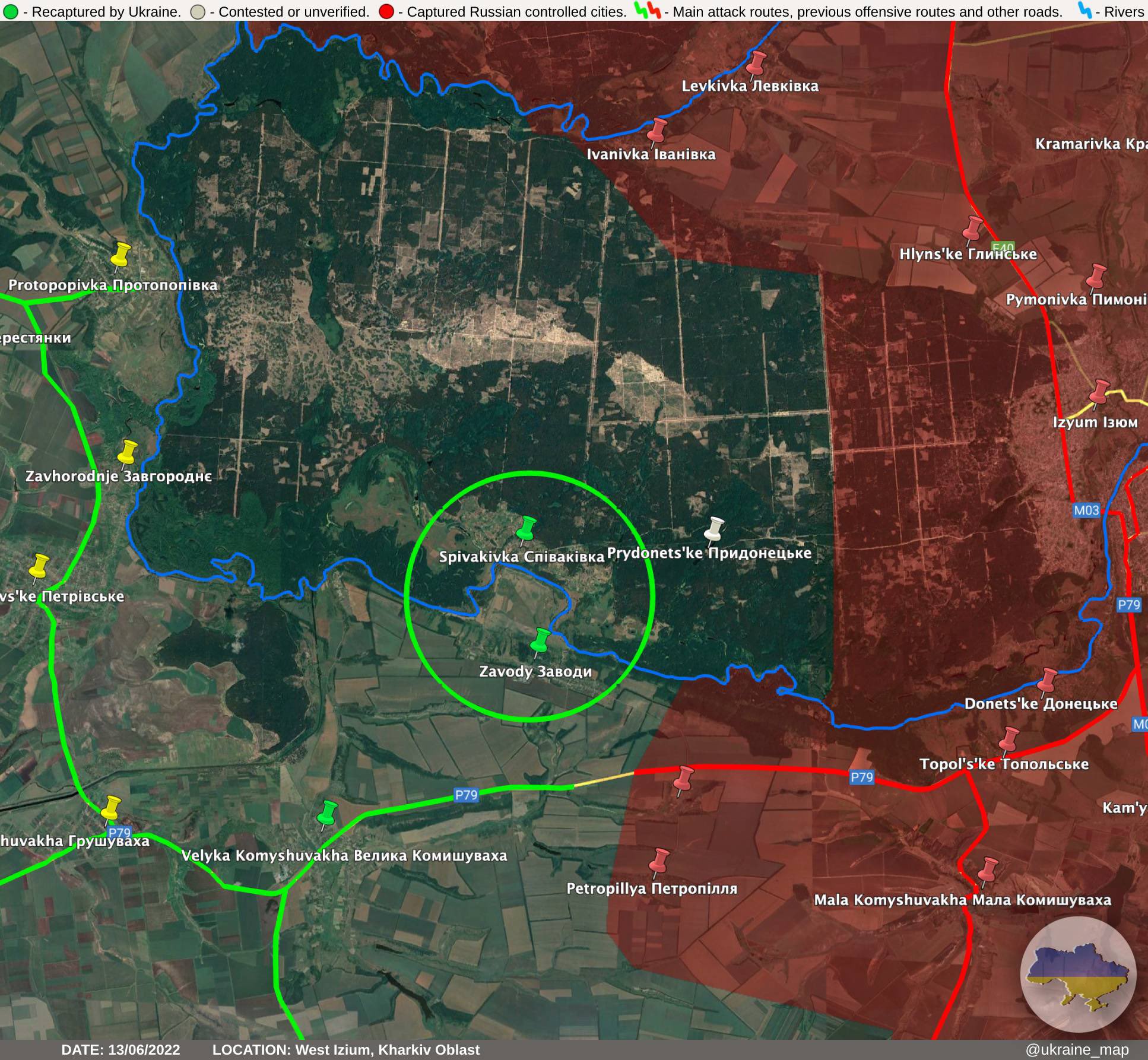 West Izium Front (June 13 5:00 AM)Ukrainian Forces have liberated the villages of Spivakivka and Zavody which are 10-15 km West of Izium