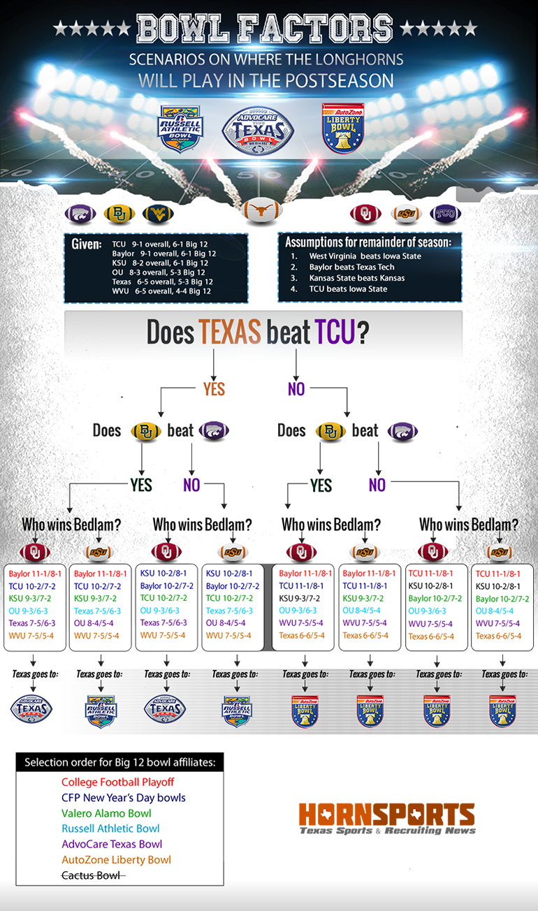 a longhornsnak még egy mérkőzést meg kell nyernie a hátramaradt kettőből hogy bowl jogosult legyen (OSU, jelenlegi 4. TCU)