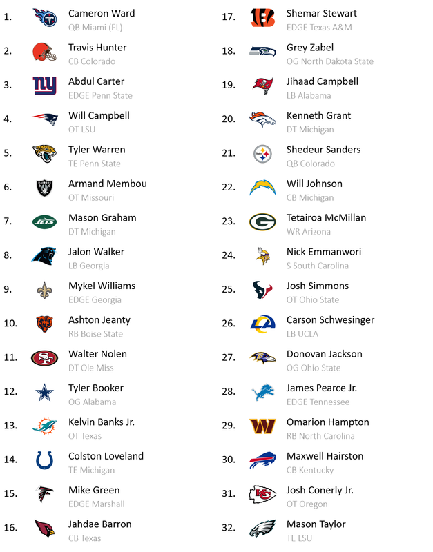 21. Shedeur Sanders, Pittsburgh Steelers, QB (Colorado): Sanders elég magabiztos, hogy a Pittsbe kerül. Azt kéne tudni, Rodgers azért vár-e, hogy meglássa miket pickelnek. Ha igen, akkor nem Sanderst fogják, hanem valami nyalisat ami meggyőzi.