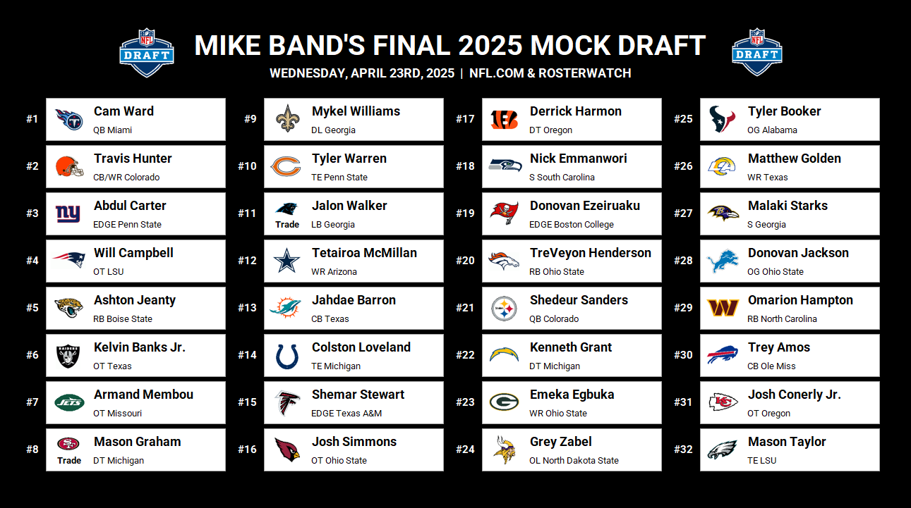 A rengeteg Cruyf által beküldött mock után jöjjön a legjobb, az enyém, alias Nagypénteken mindig mockot írunk 2025 version. Most trade-ek nélkül, azokat majd talán jövő csütörtökön a szokásos draftnapiba.1/1 Titans - Cam Ward, QB (Miami)