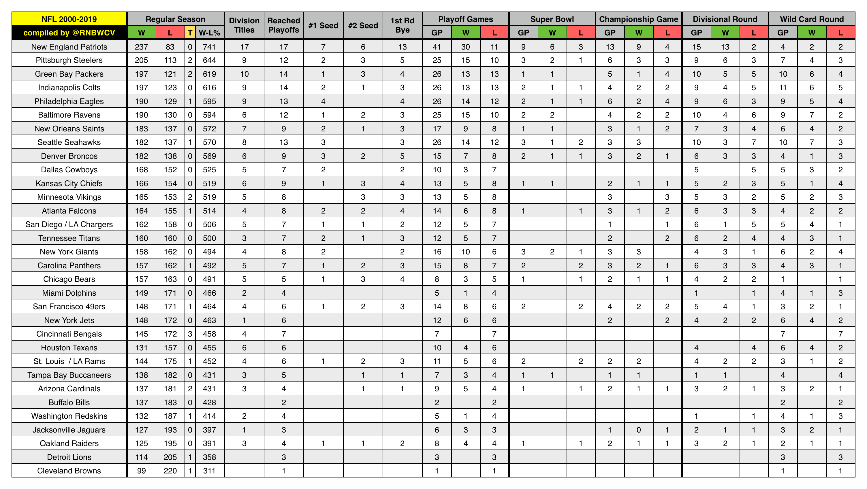 NFL 2000-2019- Regular Season record (sorted by)