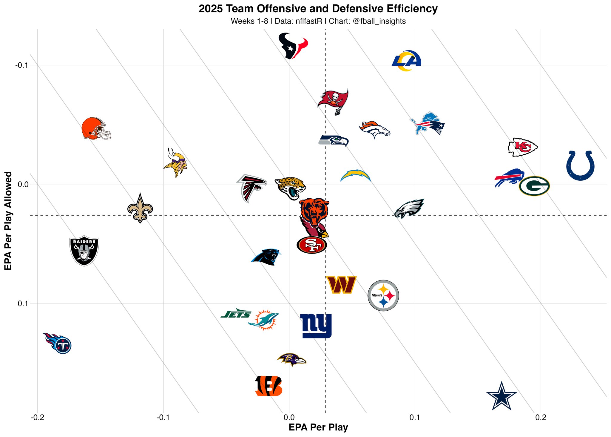 Szerintem összefügg, mert ellenfelekkel súlyozással lenne annyira reális, hogy ez ne számítson. Ezen a QB ábrázolásban/statban nincs jelentősége a 'helyezésnek' valójában a szezon ezen szakaszában. Mayfield például mvp convokban van, csak játszott a saints, lions, niners, seattle, eagles, jets, texans, falcons ellen, ami egy erősnek számító sor. Viszont arra jó, hogy irányt adjon. Kontextusba helyezve hasznos tud lenni.Én nem a módszerre gondolok, hanem a kivitelezésre.Annyira rühellem az ilyen random skálázott koordinátarendszereket, ahol teljesen más a lépték vizualizációja az x meg az y tengelyen, hogy kinézzen valahogy.én a szezon ezen szakaszában ellenfelekkel súlyozást iktatnék be, de 32 csapatot/irányítót nehéz lenne úgy szemléltetni.