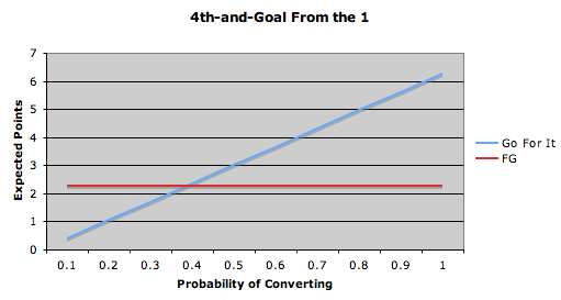 7*P-0,75: 7 ponttal számoljuk a TD-t, P annak az esélye, h megcsináljuk, -0,75 ugyanaz mint a FG-nál. ez szerintem tistza sor. Btw min 75% adtam volna, h megcsináljuk a 4th downt a liga legjobb offense-zével.