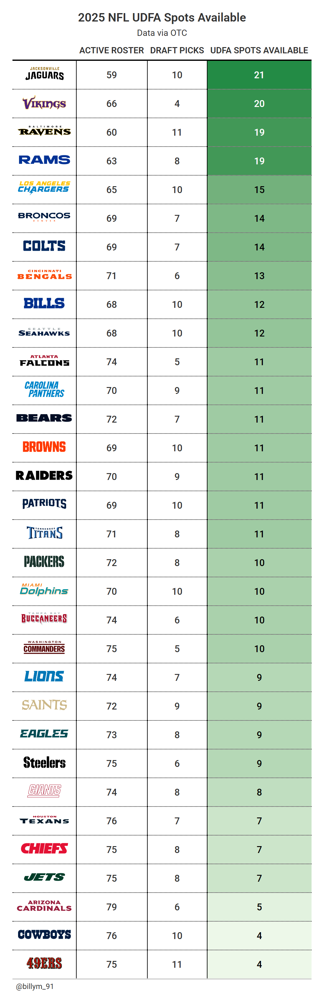 A draftig ez változhat, ahogy a cetlik száma is, de ennyi UDFA-nak van jelenleg helye minden csapatnál.