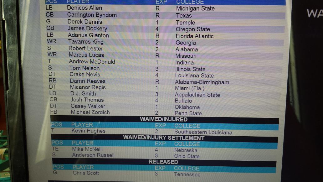 Panthers waived WR Marvin McNutt, WR Kealoha Pilares, DE Alex Hall, P Jordan Gay, DL Lindey Gaydosh, LB Anthony Morales, OL Oscar Johnson, and DL Craig Roh.A továbbiak.