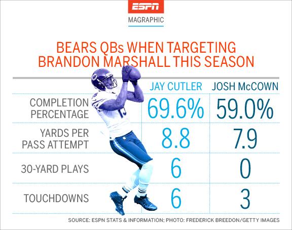 Már csak az a kérdésem, hogy ez mennyi kísérletből adódott? McCown szerintem látványosan Jeffery-t tömi, Cutler meg inkább Marshall-t.Ami számomra szembetűnő ebből a statisztikából az a 30+ yardos játékok száma. Jeffery-nek vajon hány ilyen volt McCown-tól?