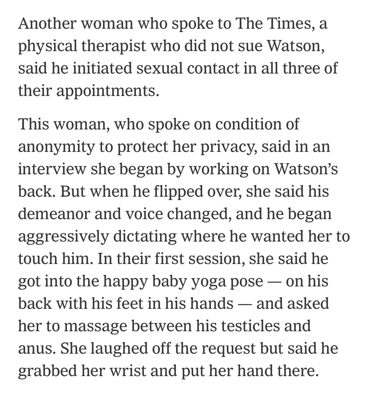 Watsonnál a 24 büntetőúgy, meg a 66 masszőr összesen azért picit több, mint gyanú. Amit itt lent is írtak az a kemény, hogy mennyire flegmán meg undorítóan nyilatkozik róla Watson meg az ügyvédje is - a maszturbáció nem bűn. Állítólag a 24. emiatt jött elő, mert felbaszta a sok flegma nyilatkozat.Csak a pontosság kedvéért írom: ezek nem büntetőügyek.