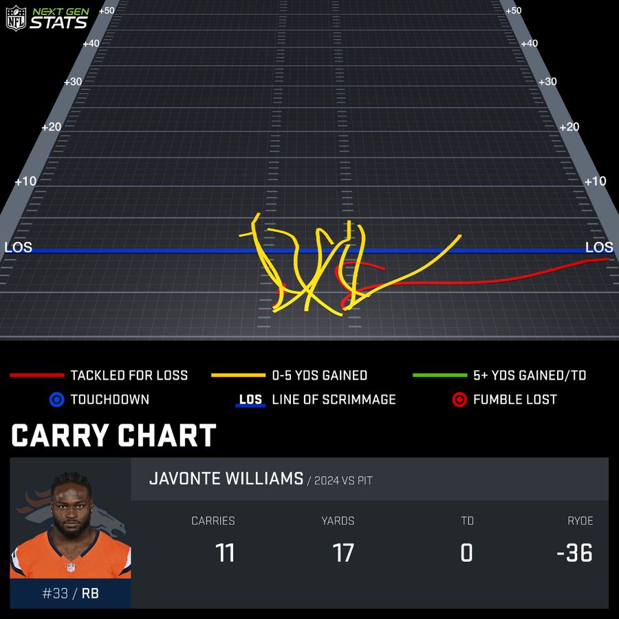 Ami extrém siralmas az a futójátékunk: 2 meccs után Bo Nix a top futónk 60 yarddal... A top RB-nk Javonte Williams meccsenként 20(!) yardot átlagol,m ami egészen elképesztően nevetséges szám: