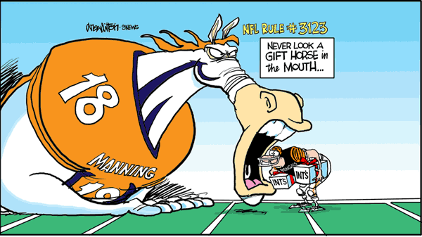 - Az elején az elkapók miatt akadozott kicsit a támadás, aztán Manning dobott 2 picket nagyon rossz helyeken. Egyszer az ellenfél endzone-ba ami miatt pontoktól estünk el, aztán közvetlen gólhelyzetbe hozva az ellent. Kishíján a meccsbe került, de meg kell jegyezni, h utána ő húzott ki minket a gödörből.