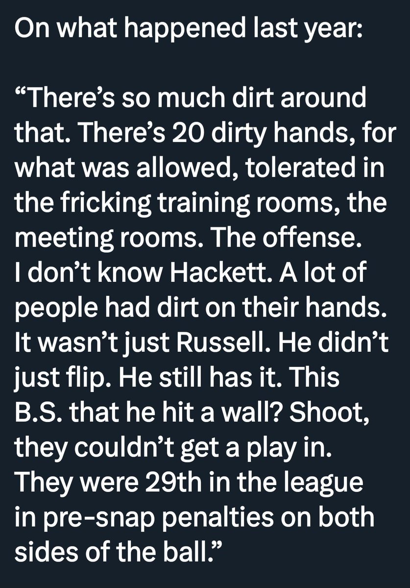 Ó, nem csak Hackettet emelte ki, hanem az egész szervezetet és egy picit Russellt is.Aztán, ha újra égni fog a Denver idén is, akkor lehet mutogatni, hogy no lám, mennyire szar volt Hackett munkája és, hogy ráment Wilson. Ezért draftolni/tradelni kell egy HoF zsenit SP kezei alá, hogy edzőbá ki tudjon teljesedni again. (HoF irányító nélkül SP lófasz volt) Ez azért is lenne jó, mert instanst lehetne nyerni 2 évet a szerződésből, még a kirúgás előtt, hiszen be kell érnie a munkának, össze kell csiszolódni, be kell tömni a lukakat.Valahogy vissza kell építeni Russ önbizalmát. Ez egy jó módja is lehet. Hackett munkája érdekli a legkevésbé.Hetfoig nyaralok, utana igyekszem felvenni a fonalat, addig is:Payton azert bekezdett rendesen. Elég komolyan beleszallt Hackett-be meg a Jets-be is. 😀