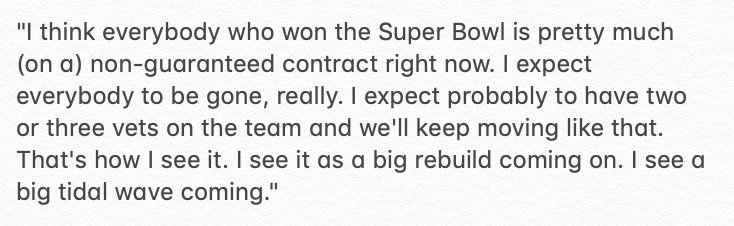 Engem azért meglepne, ha itt nagyon nagy jövés-menésbe kezdene Elway a tavasszal. Igazából ha csak a lejárókat nézzük, én a Heuerman, Patrick, Paradis, Shelby Harris, Barrett sort biztosan hosszabbítanám. Akik kérdésesek, egymástól, lehetőségektől, drafttól, fa-tól is függnek: Veldheer, Peko, Ray, Roby, Brock (innen szerintem legalább hárman hosszabbítva lesznek, a veteránok nyilván max 1-2 évre). LaCosse, Thomas, Kerr, Garcia etc nyilván out...
