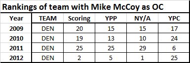 Am McCoyra én úgy emlékszem, mint aki potens O#-t rakott össze TT és PM alatt is, de ez a stat azért egy kicsit ellentmond ennek (aki nem tudná, az utolsó év PM alatt volt):Hát amíg PM egészséges volt, addig ahol éppen pályára lépett ott általában top3 offense működött, szóval a 2012-es 2. hely inkább PM miatt volt. Edzőként nehéz ilyen teljesítményt produkálni (ha lehet egyáltalán) anélkül, hogy nincs ilyen irányító a csapatban. Vele meg majdnem automatikus. Tebow toolsetje viszont annyira távol esett a konvenciális NFL szerepkörtől, hogy már az szakmai teljesítmény, ha az offense teljes felborítása/átalakítása nélkül (értsd neki passzoló fal, fordított LT/RT-felállással, read option, az ebbe a stílusba passzoló skill játékosok, stb.) egy működő egységet sikerül összerakni.