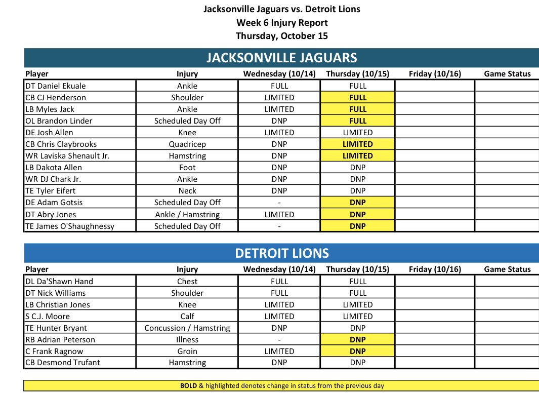 Nálunk úgy tűnik nem lesz a legjobb WR-ünk Chark. És a 2. legjobb(Laviska) is sérült. Viszont a 3 legjobb védőnk visszatér, tehát így csak 30-35 pontot fog szerezni a Lions vasárnap...