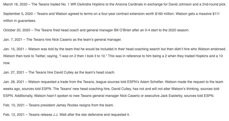 utánanézve ki az ügyvéd stb azért nem lepődnék meg ha ez célzott lejáratás lenne, pont azért h watson beadja a derakát (vagy valamelyik suitor nyomja le az árát)Mondjuk ezután lehet holnap beugrik a csapathoz hogy na nem is úgy gondolta csak valamit félreértett itt mindenki.Watson story egyre izgibb leszA Qb needes csapatok is kezdenek egyre inkább letenni a Watson-projektről. Nagyon afelé halad a dolog, hogy vagy ezért vagy azért, de nem fogjuk Watsont a pályán látni 2021-ben.
