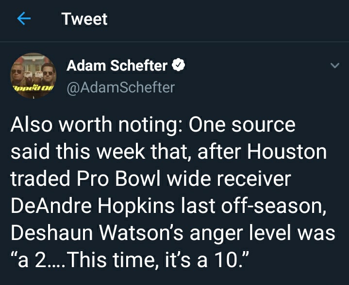 Also worth noting: One source said this week that, after Houston traded Pro Bowl wide receiver DeAndre Hopkins last off-season, Deshaun Watson’s anger level was “a 2….This time, it’s a 10.” https://t.co/CsqZYbe3OK