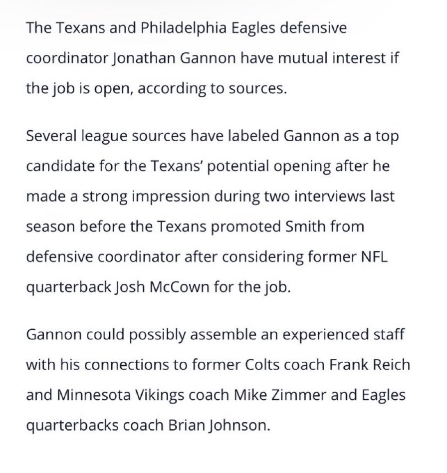 A few more #Texans requests: DeMeco Ryans of the #49ers and Jonathan Gannon of the #Eagles… plus #Broncos DC Ejiro Evero, sources say.