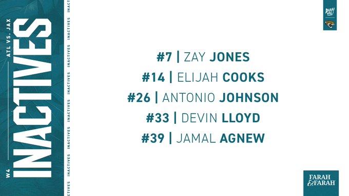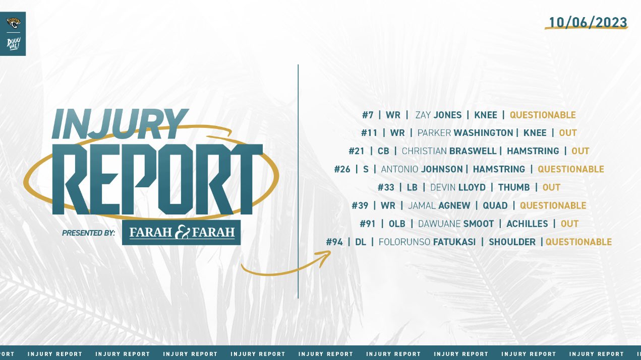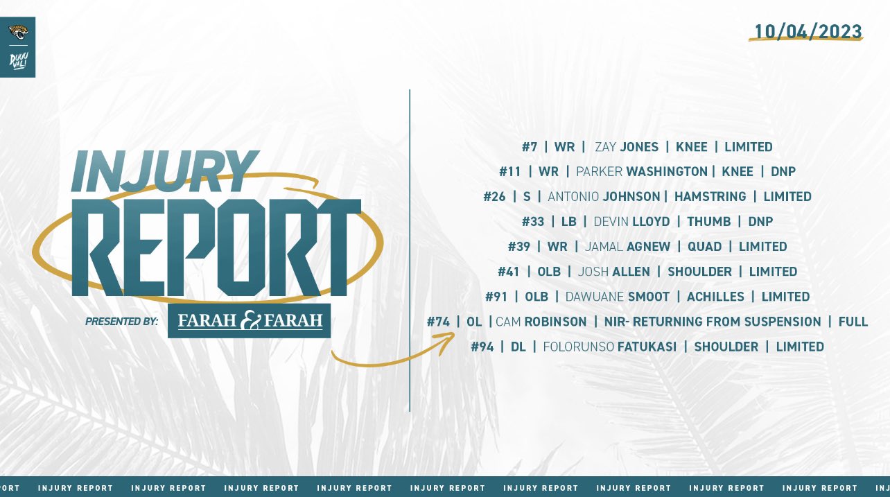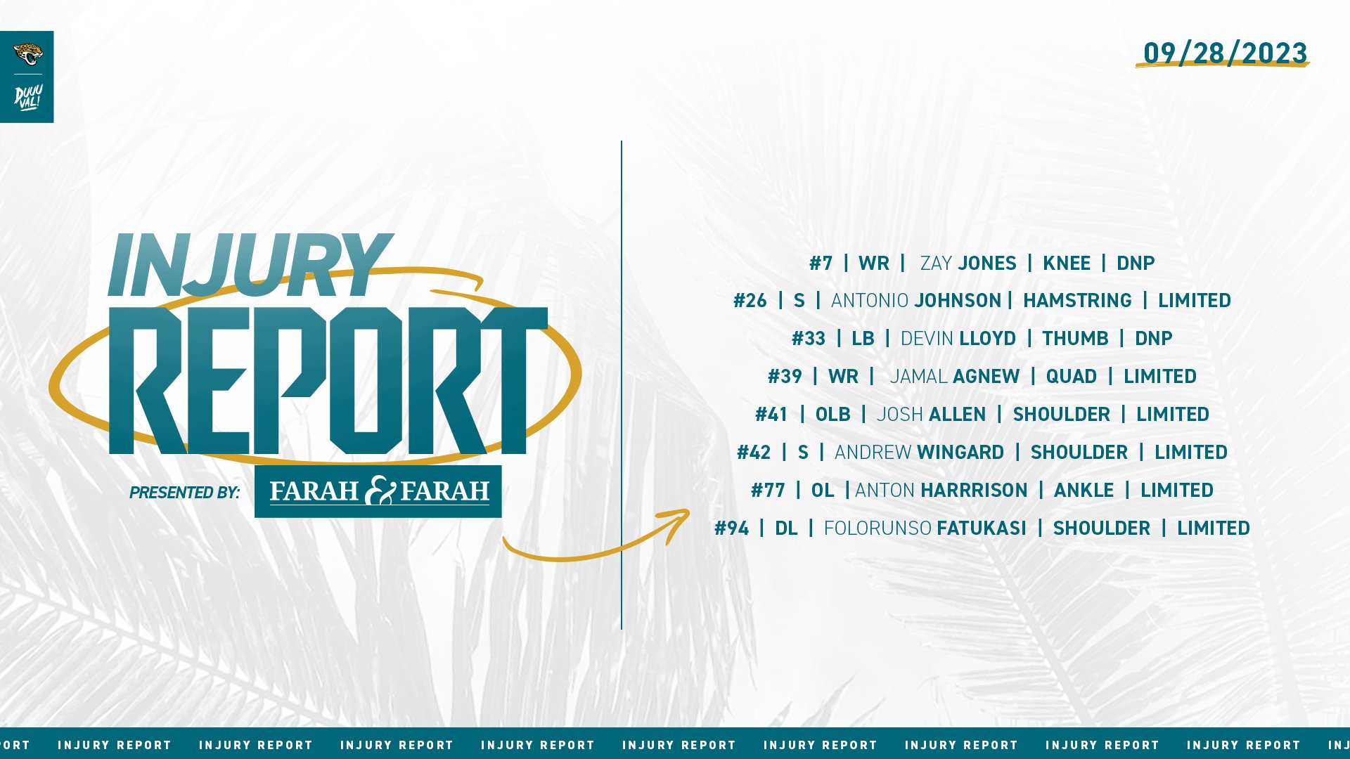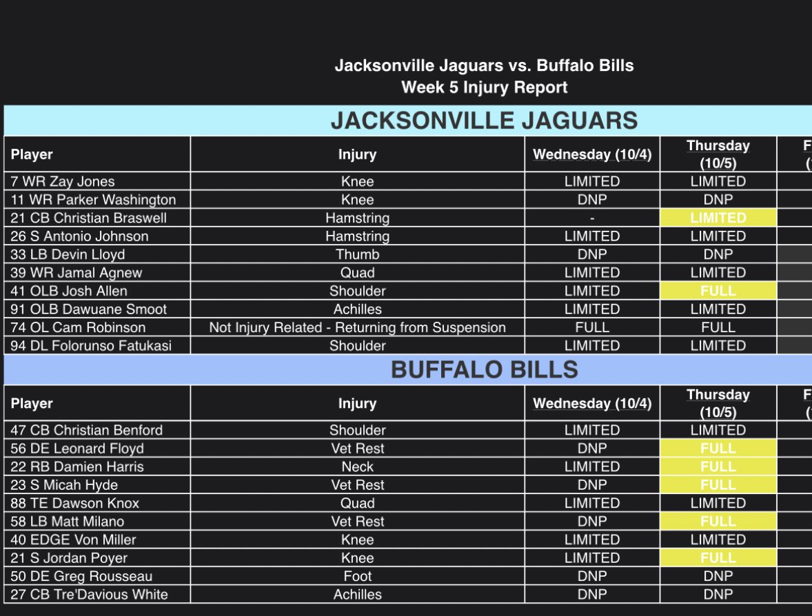 Zay Jones megint nem lesz, Agnew meccsnapi döntés. Ha ő sem bevethető, akkor Parker Washington bemutatkozhat élesben is.