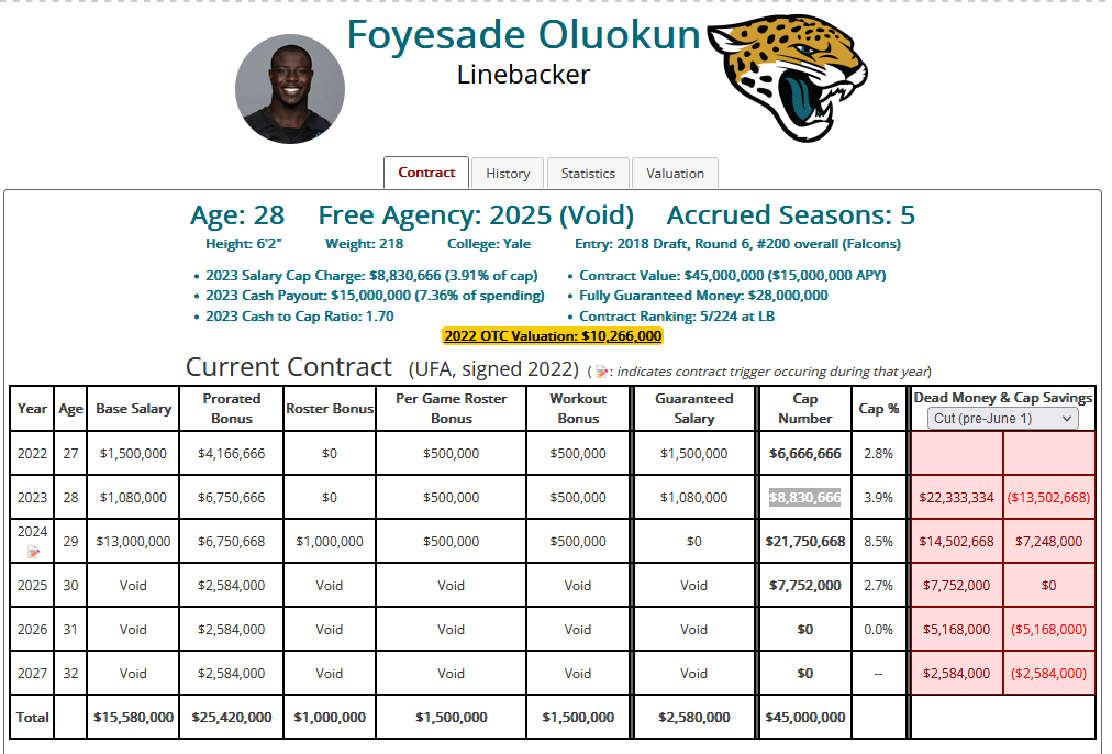 According to OverTheCap, the #Jaguars added three void years to Oluokun's deal, giving him a $10.336M signing bonus (what the team saved for their cap space).