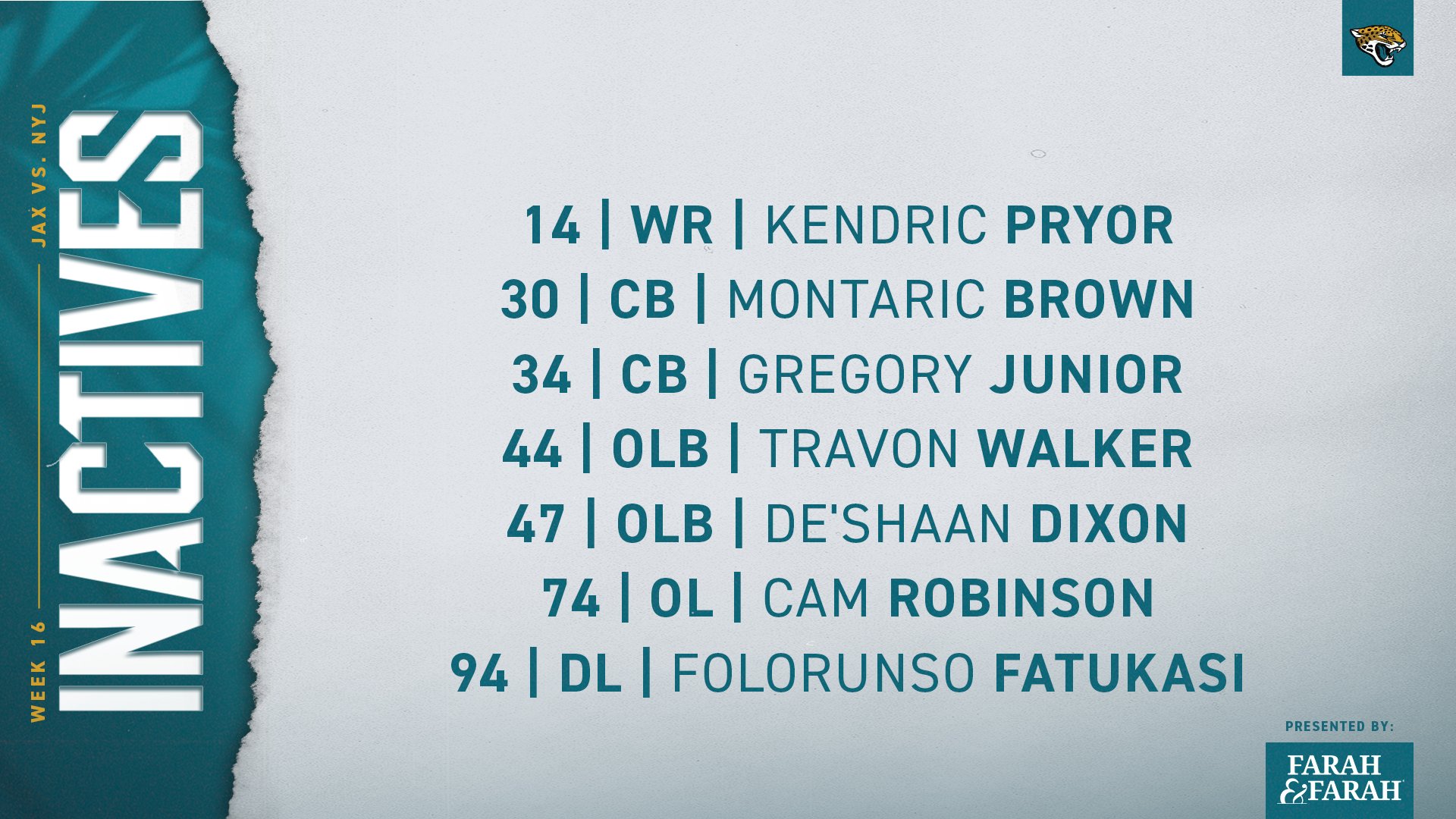 Fantasy miatt, esetleg van infó, hogy Chad Muma játszani fog ma?Elvileg csak Fatu és Walker az új ruled out. Kelleni fog Muma, tuti kap pár snapet. A jaxa defed? Bátor de okos húzás 😀