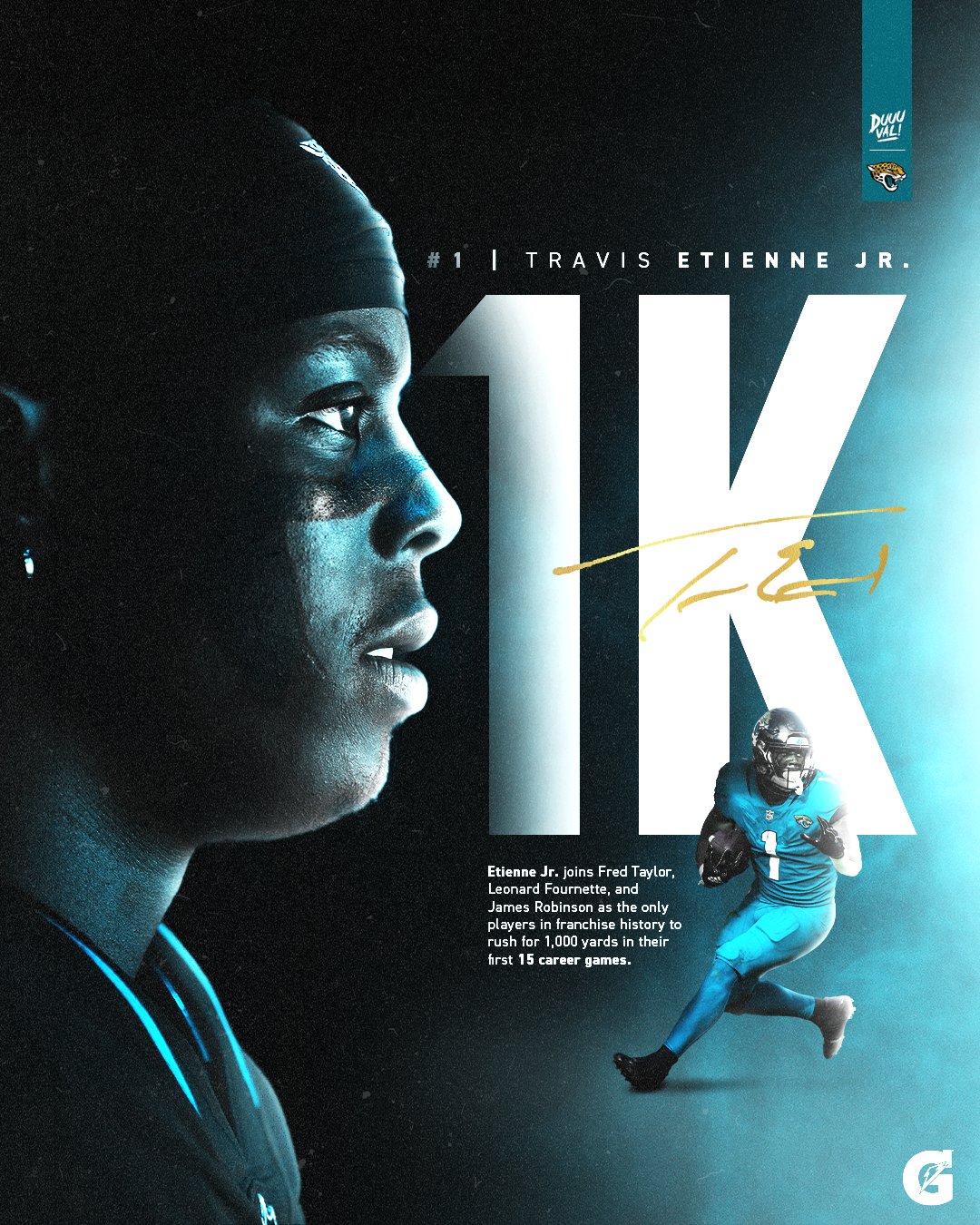 Etienne-nek megvan az 1000 futott yardos szezon, pont 83 yardot futott, amennyi még kellett. Kirknek még 12 hiányzik az 1000-hez.