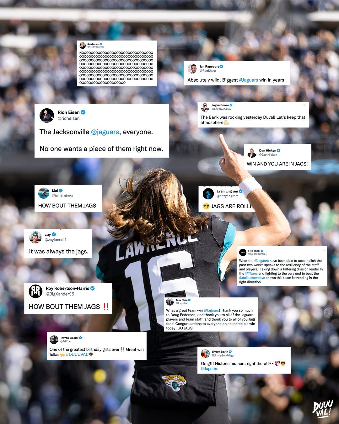 - 2 ilyen feltámadást, mint a Vikings és a Jags feltámadása egyetlen játékhéten! Őszintén szólva én a Vikings feltámadását éreztem kicsit, nem is kapcsoltam el róla, bár azt nem gondoltam, hogy a végén tényleg behúzzák, viszont a Jags feltámadását 27-10 és interceptionnél nem éreztem valószínűnek, de csodálatos, hogy végül így sikerült!