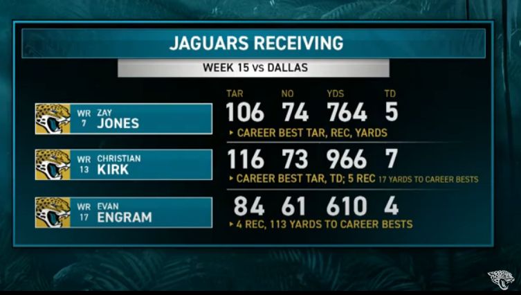 The Jaguars are on the verge of accomplishing something that Doug Pederson's offenses in Philly and KC never did: Have a 1,000-yard rusher and 1,000-yard receiver in the same season. Travis Etienne needs 83 rushing yards and Christian Kirk needs 34 receiving yards to hit it.