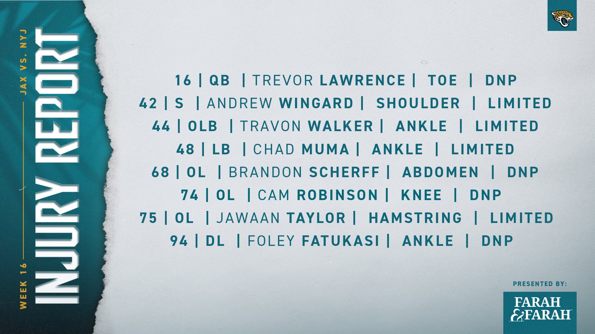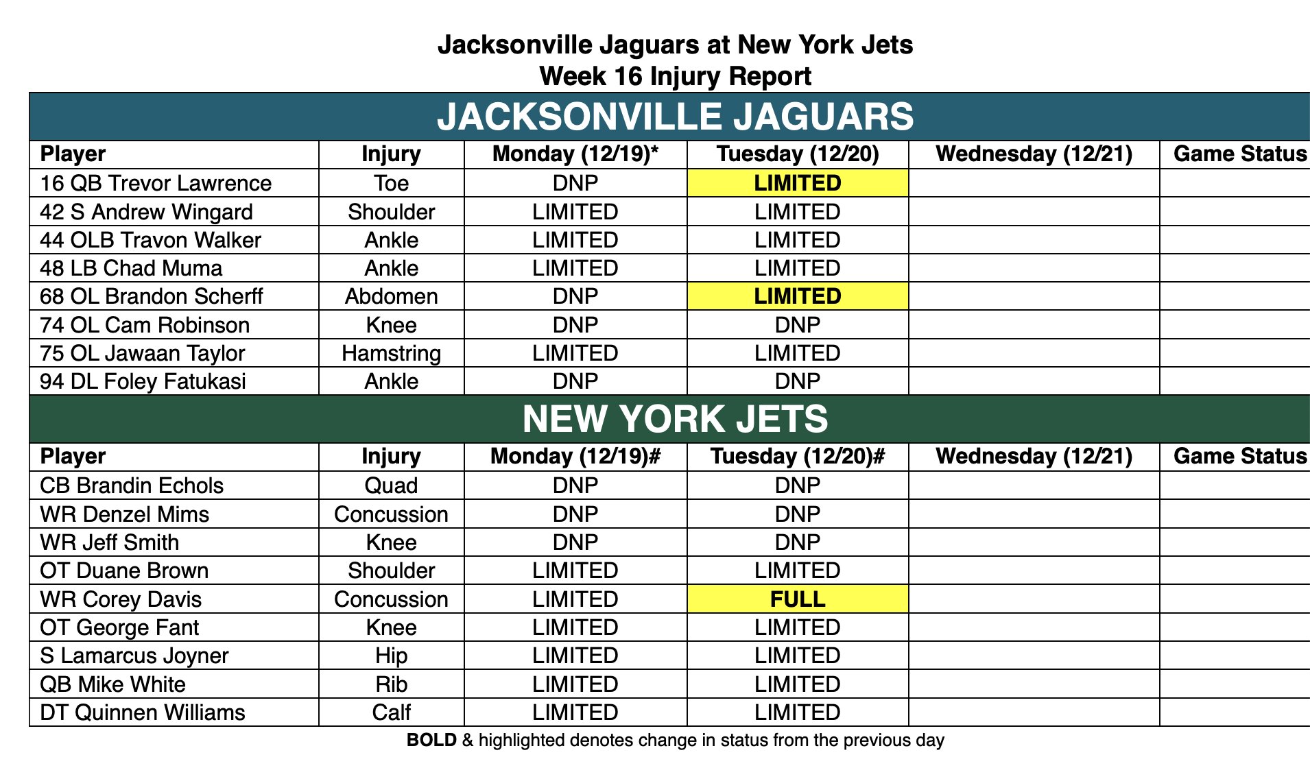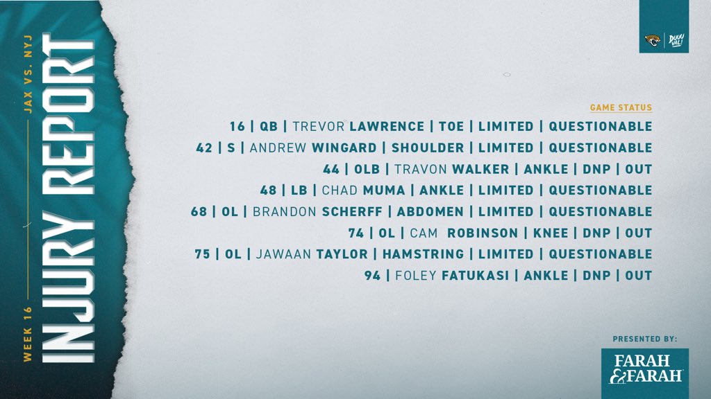 Az IR-re tartó Cam Robinson mellett "csak" Fatukasi nem edzett. Jó lenne, ha Walker tudna játszani, mert így legalább egy másik jó run defendert visszakapnánk. Muma is érdekes - 11 snapet játszott a Cowboys ellen, Lloyd ezért volt szinte mindig fent. Érdekes lesz látni ez hogy változik csütörtökön.