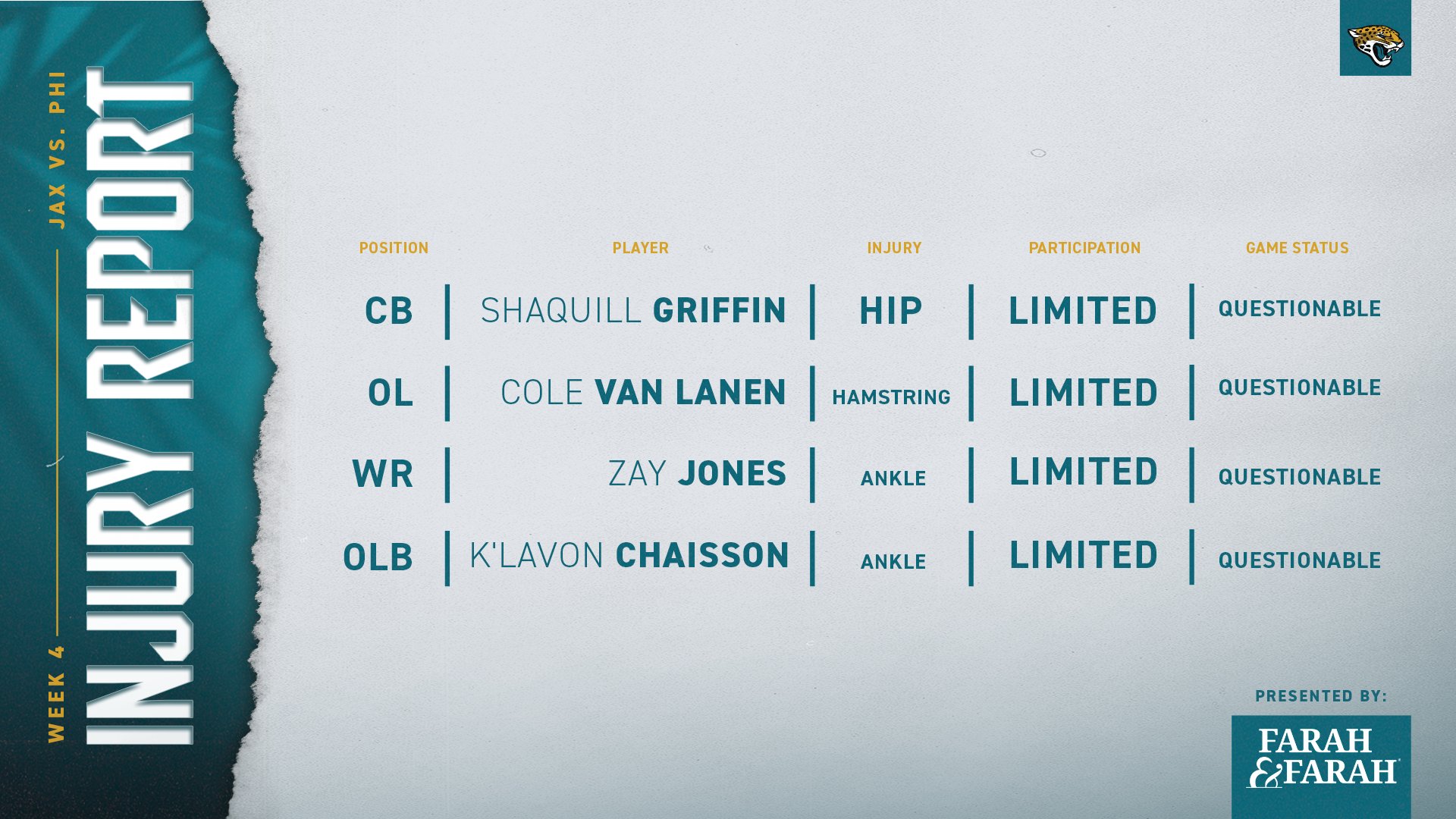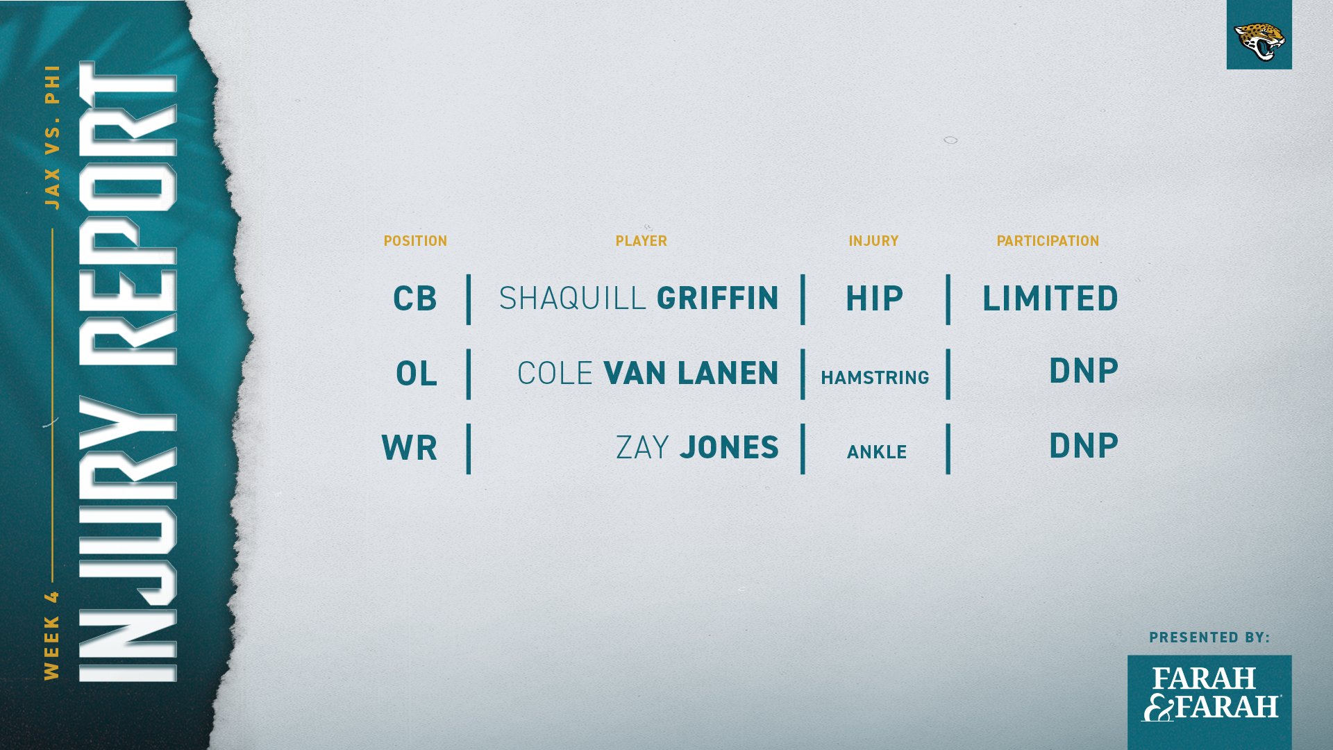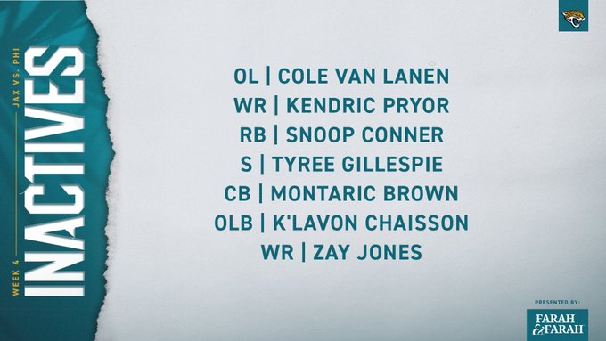 Jawaan Taylor bukott egy kis pénzt vasárnap, azok után, hogy a PFF szerint 0/Shipley szerint 1 QB pressure jött róla az első három meccsen, az Eagles ellen 3 nyomást engedett, ebből 2-ből strip sack lett... Mindeközben a túloldalt Cam Robinson 0 nyomás engedéssel hozta le a meccset, mindezt Josh Sweat ellen!
