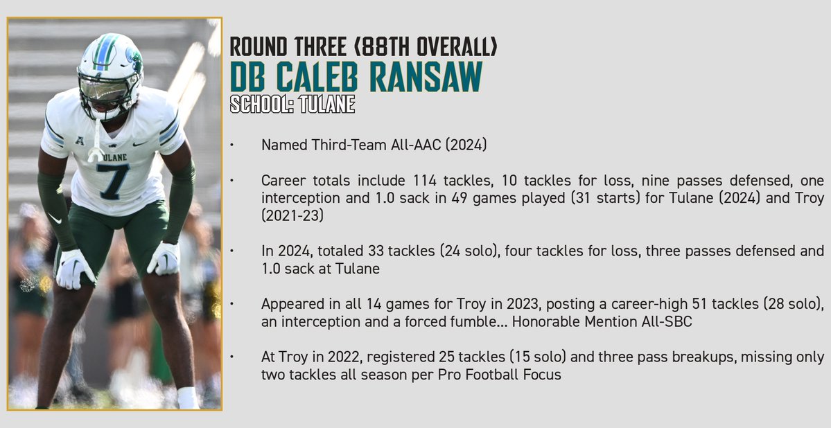 With the 88th pick, the Jacksonville #Jaguars select Caleb Ransaw- CB, Tulane.