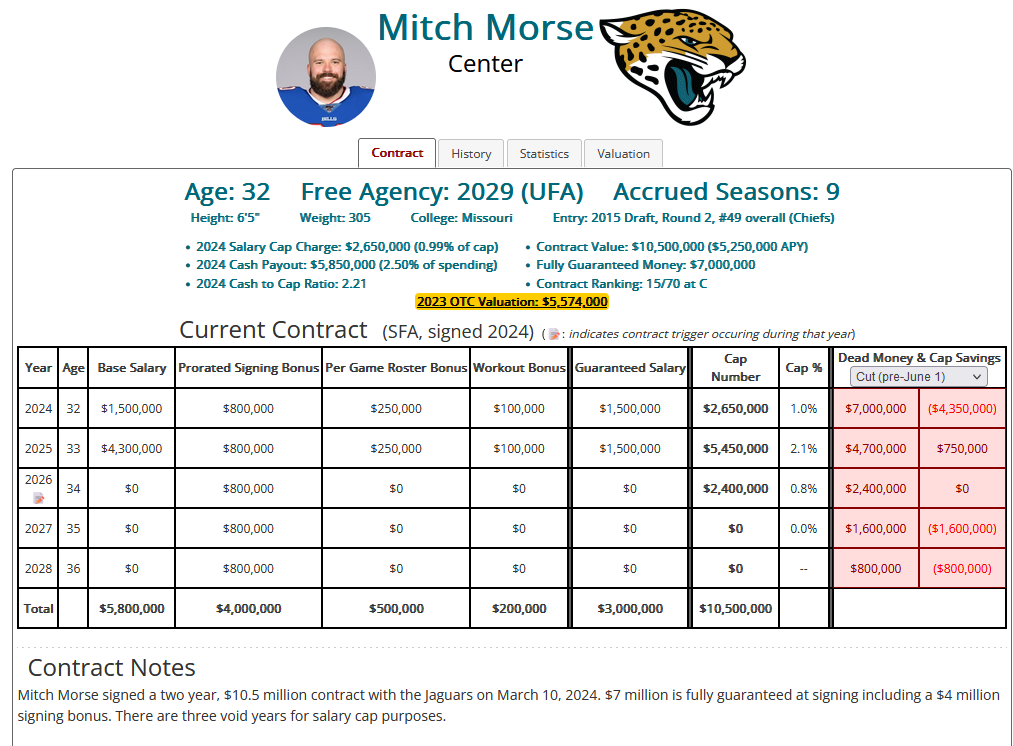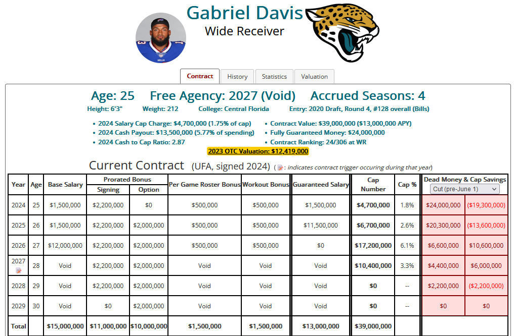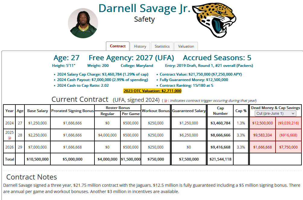 We're starting to get some official contract numbers in, but we're still missing Ronald Darby and Devin Duvernay. Assuming the largest possible cap hit this season(convert first year to signing bonus, bare minimum the team does), the Jaguars would currently… pic.twitter.com/P3vKmD6m5F