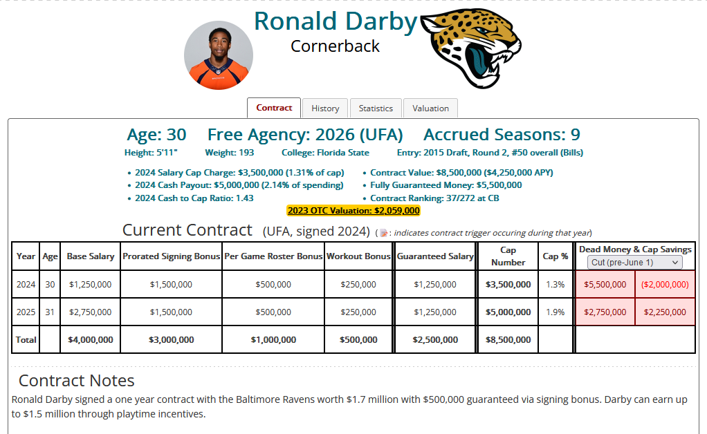 #Jaguars deal for Ronald Darby: two years, $8.5M, $5.5M gtd, $3M signing bonus, salaries $1.25M (gtd), $2.75M ($1.25M gtd), annual $29,412 per game active roster bonuses up to $500K, $250K workout bonus, $750K playtime, Pro Bowl incentive annual