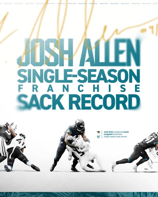 Josh Allen is just ONE sack shy of Calais Cambell's franchise record of 14.5 sacks. #Jaguars