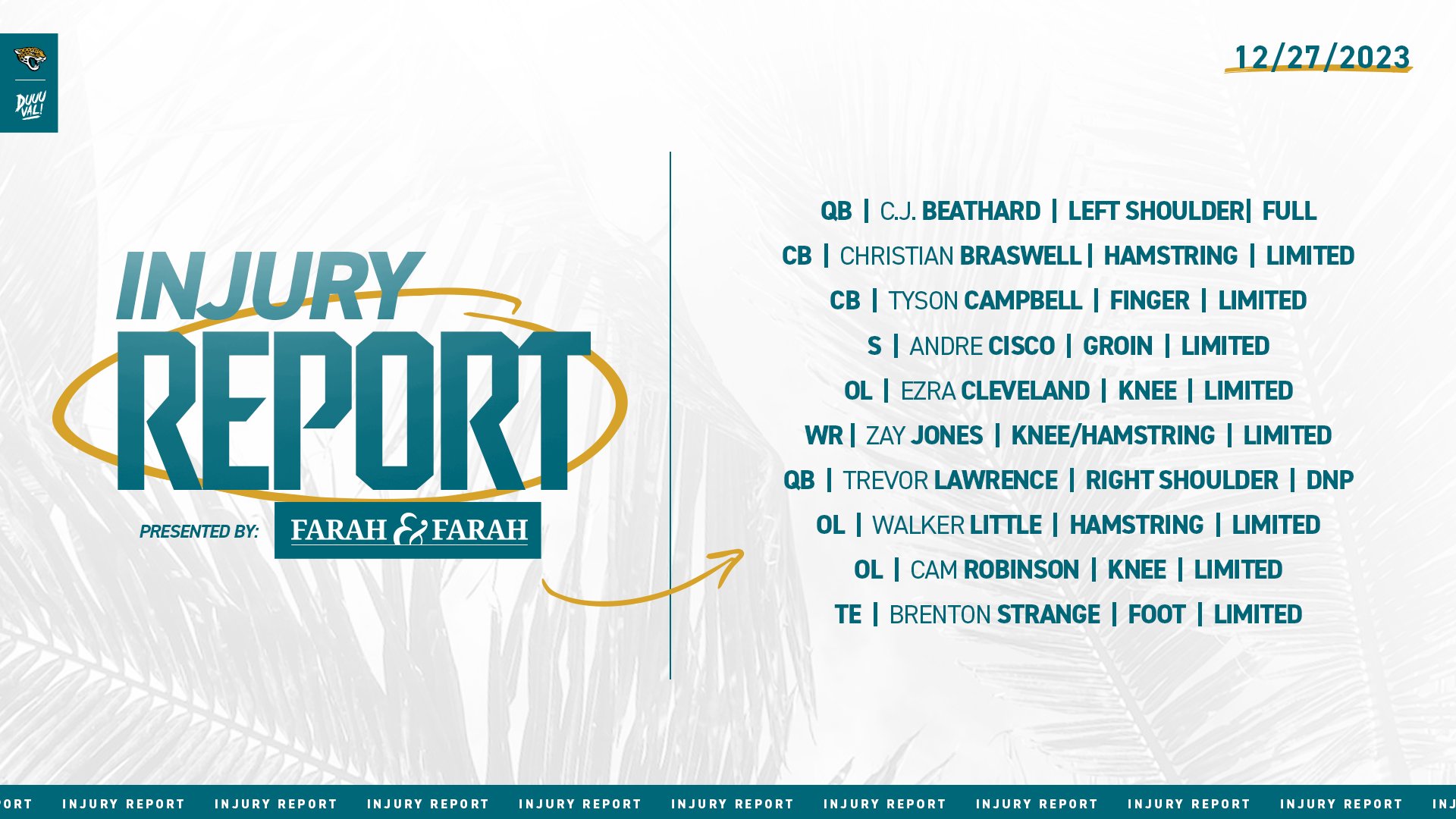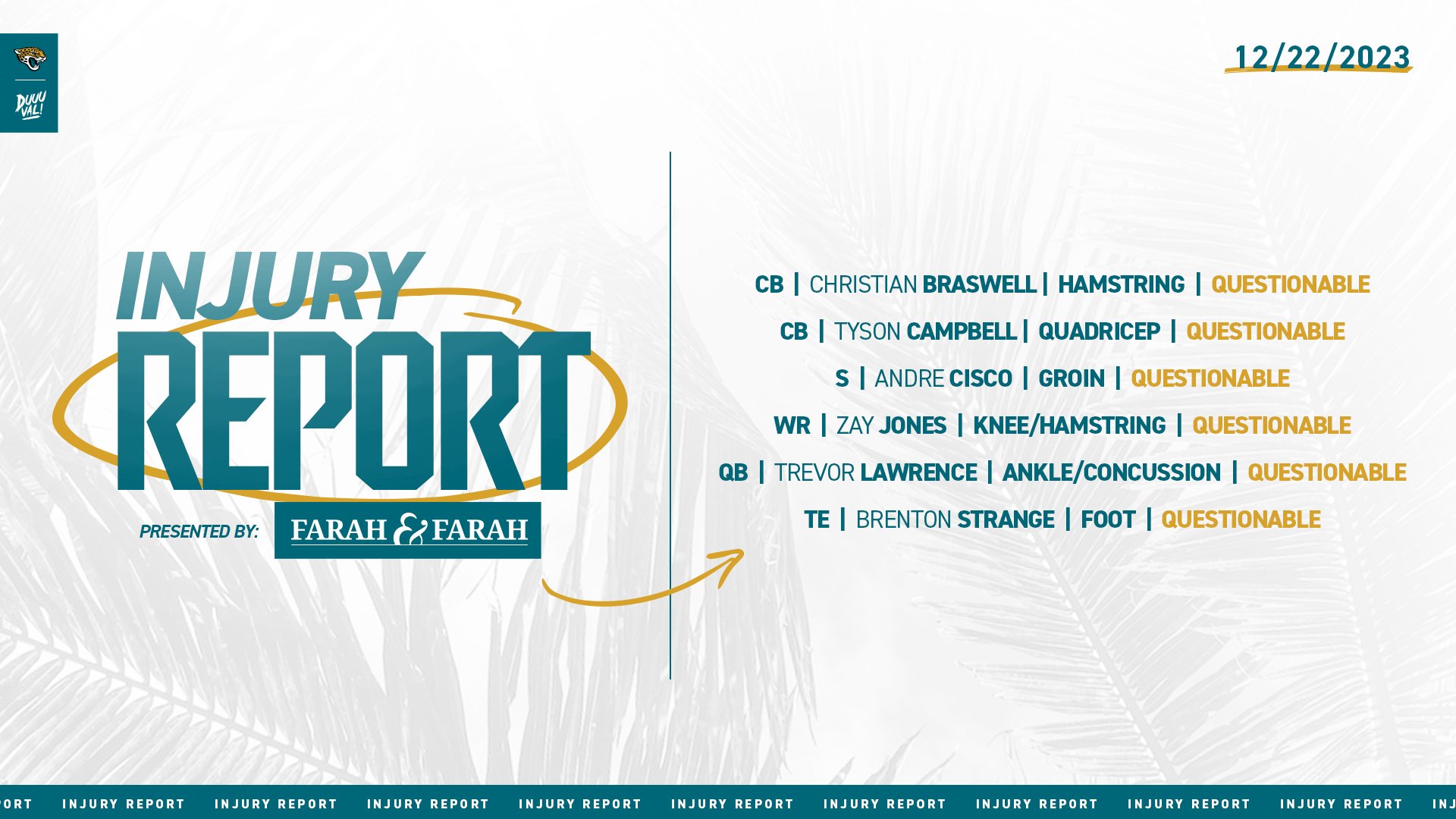 Doug says Brenton Strange (foot) should be good to go. Said he's "optimistic" Tyson Campbell (quad) and Andre Cisco (groin) can play vs #GoBucs#Jaguars | #DUUUVAL