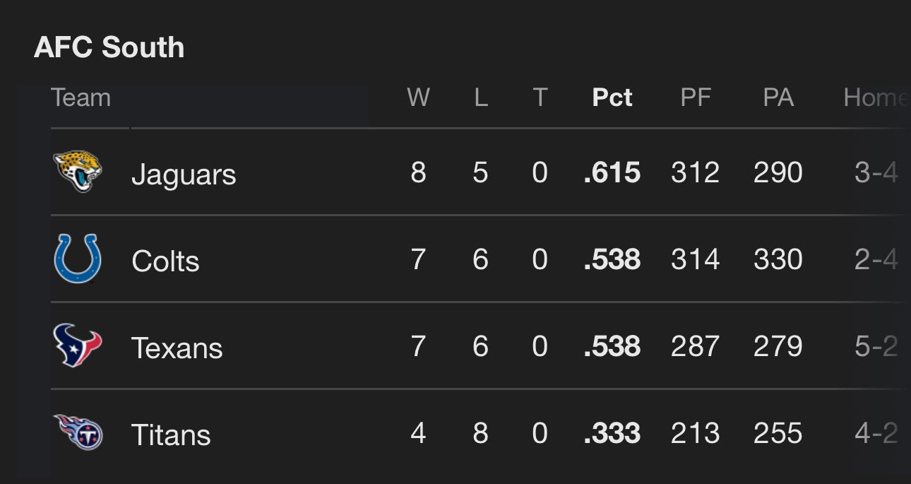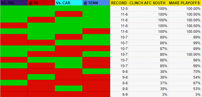 A tie brakerek miatt még akkor is nálunk az előny ha beérnek minket, de egyre kevesebb a hibázási lehetőség és jön az AFC 1. kiemeltje. Csak abban tudok bízni, hogy Ravens Jacksonvilleben (és egyszer Londonban, amikor mi voltunk a "hazai" csapat) mindig beleszaladt a sokszor teljesen váratlan pofonba ellenünk mostanság, Hátha idén is ez lesz.