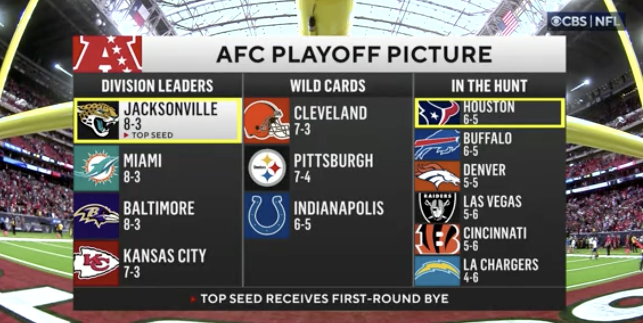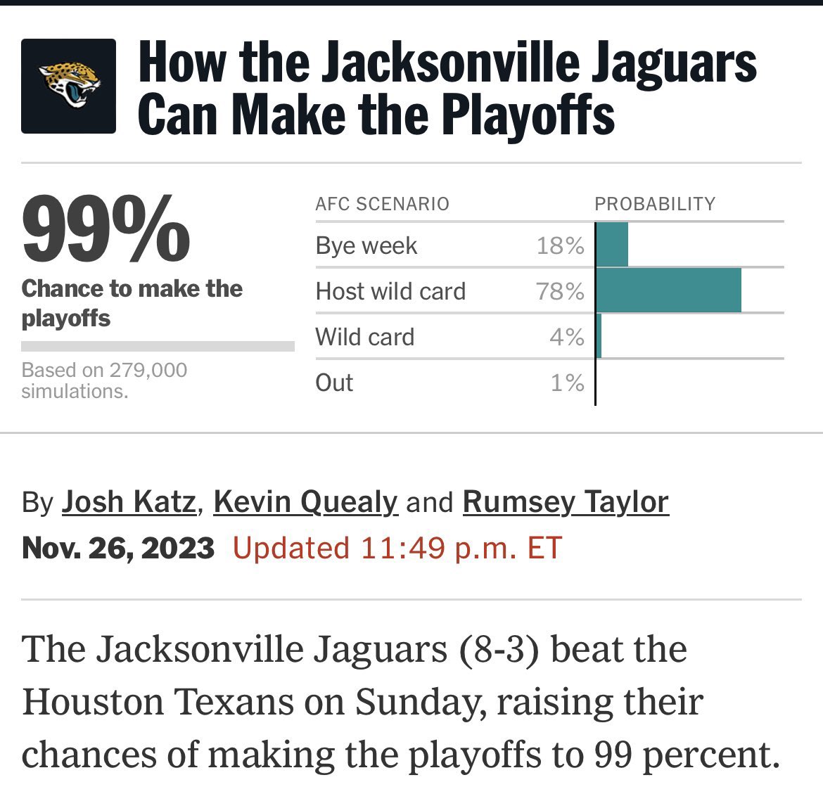 A meccs után 93% az esély a csoportgyőzelemre és 98%, hogy meglesz a rájátszás. 1 meccsre vagyunk, hogy meglegyen a tavalyi PO-t és AFC South trónt érő 9 W és van 6 meccs hátra.