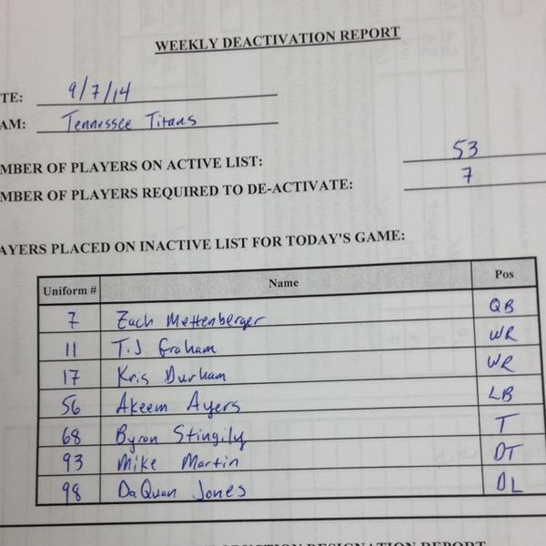 A két sérült, Derrick Johnson (ILB), és Mike DeVito (DE) IR listára került.Az újonc safety, Sorensen kivágva. Nem lepődünk meg.