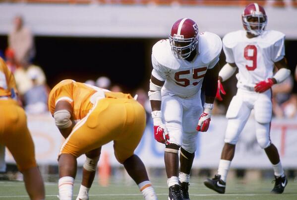Derrick Thomas, minden idők egyik legjobb NFL LBje, NFL HOF tag, bekerült az NCAA HOF hősei közé is. Itt látható Alabama játékosként: