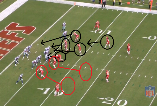 Aham, de ha megnézzük ugye a jobb oldal telitöltve (KC felől), az ő jobb oldalukon (nálatok bal) felveszi a két D-man az O-line emberkét, a WR-t elvileg a CB, de erre az oldalra futójáték közvetlen a QB mellett lévő emberkével nem veszélyes?kishasziNem. Ezért lép vissza két piros karikába a két védő. Nyilván a karika nem pontos, ha futást olvas a védő nem fog odáig futni.